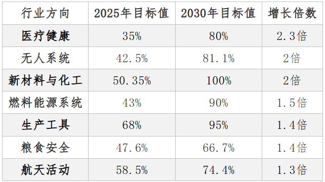 该指标按国民经济细分行业分别测算技术自主水平,由各主管部委及副总理按职责分工推进,并明确2030年分行业目标值(具体数值见下表)。