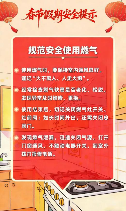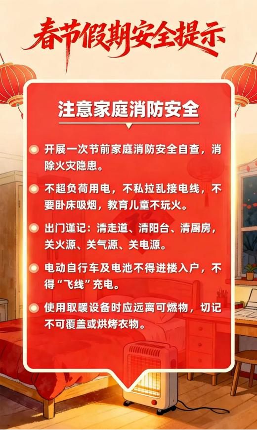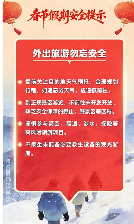 新春佳节来到 用火用气用电增加 出游、出行、运输迎来高峰 灯会、庙会、促销等大型活动多 宾馆、饭店、市场、商超等 场所人流密集 烟花爆竹产销燃放正值旺季 低温雨雪冰冻等恶劣天气多发 各类风险隐患交织叠加 安全工作须臾不可放松 这份春节假期安全提示 请查收 防风险、除隐患、遏事故 平安过春节!!!