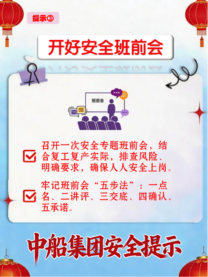 节后复工既要跑出“加速度”,更要守好安全“生命线”.复工复产要警惕哪些安全隐患?如何防范事故发生?如何确保复工复产安全有序、平稳推进?这份安全提示请收好。